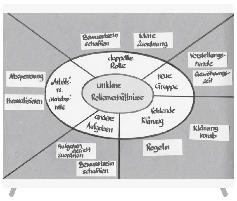 Entscheidend für den Erfolg dieser Aktionsform sind zwei Dinge: die passenden Leitfragen und die Art und Weise der Visualisierung. Die Leitfragen folgen dabei immer einem ähnlichen Muster: Ausgehend vom Problem oder einem Problemaspekt führen zwei oder drei weiterführende Fragen zu einer Vielzahl möglicher Lösungsansätze.