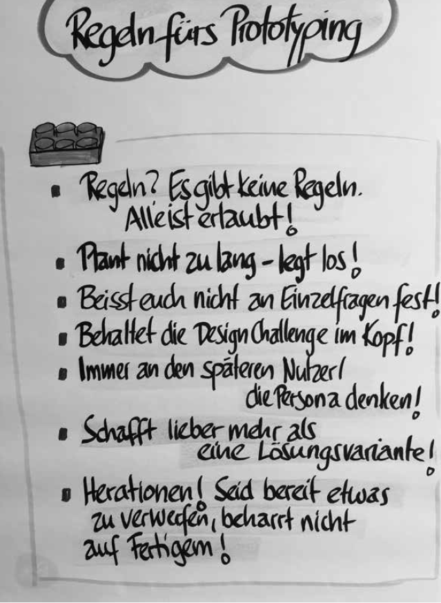 - Zeigen Sie die wichtigen Leitlinien für das Prototyping auf. Verdeutlichen Sie, dass es darum geht, „ins Tun“ zu kommen.
